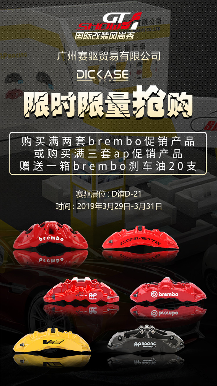 2019 GT SHOW,廣州賽驅(qū)攜AP和brembo兩大高端明星產(chǎn)品和熱銷DICASE新品出席。